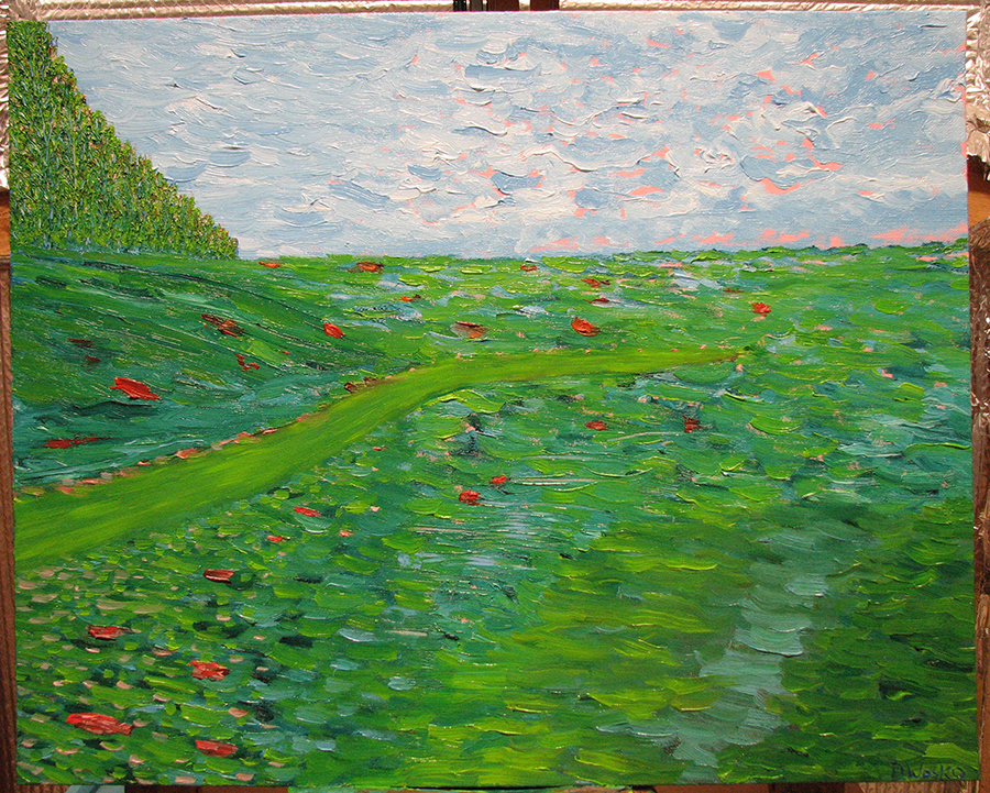 A Contemporary Painting of a Meadow of Green Lilies Blue Streams, Pink Village, Green Meadow Artwork